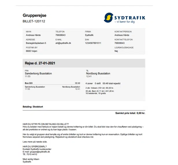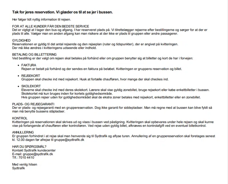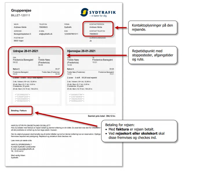 Selve grupperejsen er en reservation af plads i bussen. Hold derfor øje med om der på billetten står Betaling: Faktura, eller Betaling: Skolekort