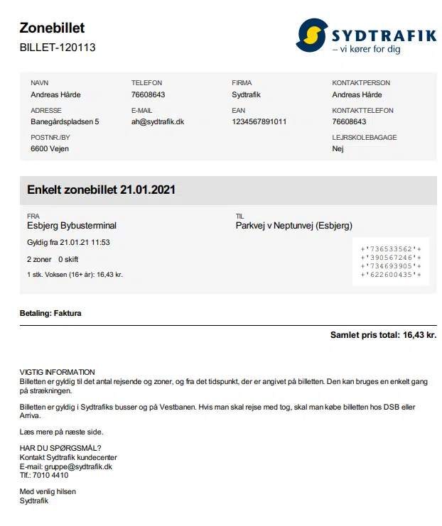 Zonebilletter er altid betalt via FAKTURA. Kunden skal altså kun vise kvitteringen og skal ikke vise anden billet eller rejsekort.