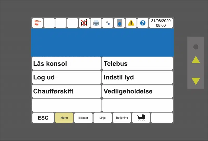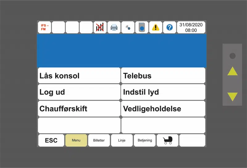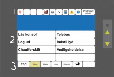 | Chaufførskift | Du skal trykke her, når du overlader bussen til en kollega, som skal køre videre. Der bliver automatisk udskrevet en salgsopgørelse til di. Hvis du trykker på printerikonet i toplinjen, vil du få udskrevet en ekstra kopi af salgsopgørelsen. Den valgte linje og tur bliver stående til din kollega. |